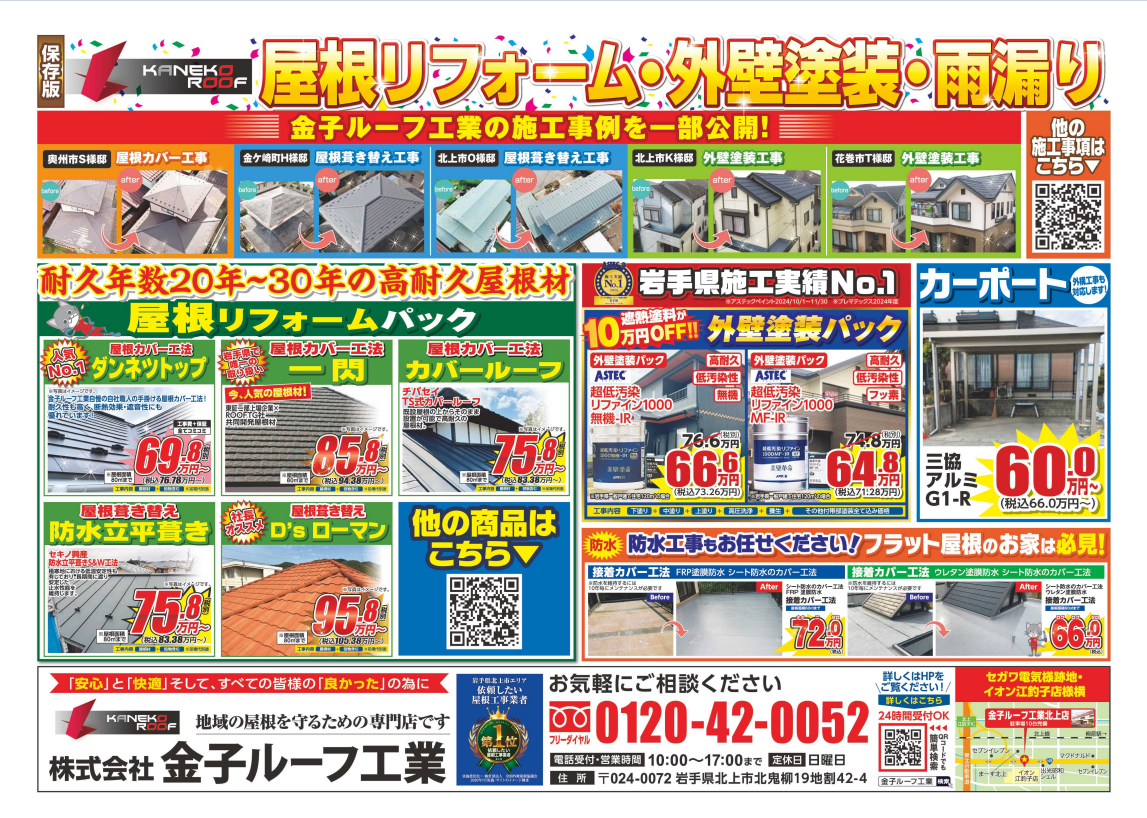 今日は北上市、花巻市、奥州市、遠野市密着の屋根修理専門店の