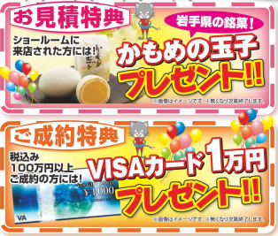 税込み100万円以上ご成約のお客様に、VISAカード1万円をプレゼントします✨