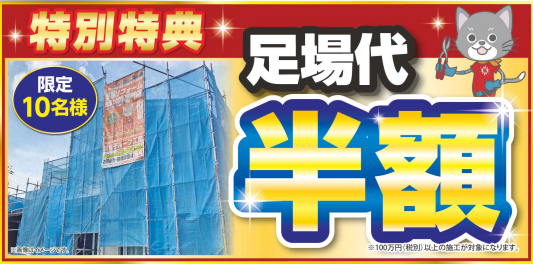 100万円(税別)以上の施工で足場代を半額といたします!リフォームに欠かせない設備だからこそ嬉しい、大幅お値引きです♩