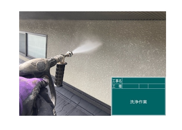 外壁塗装工事です。高圧洗浄を行います。外壁塗装工事 下塗り