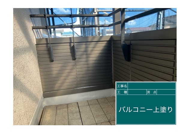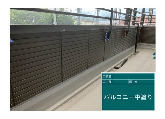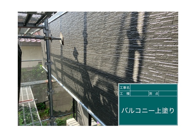 ベランダ外壁塗装工事②です。下塗り後に中塗りを塗布します。ベランダ外壁塗装工事② 上塗り