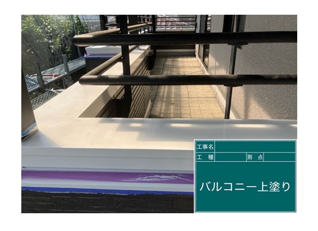 上塗りを塗布して完成です。ベランダ床防水工事 洗浄