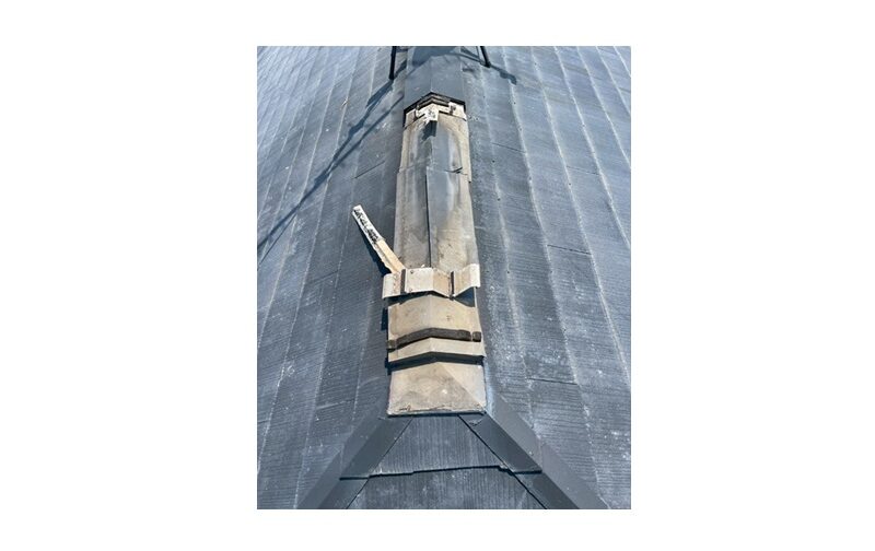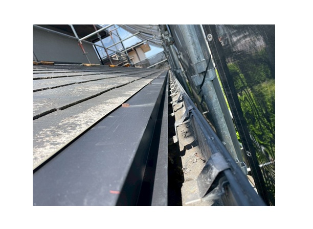壁際雨押さえを下地→ルーフィング→板金の順で設置します。屋根棟工事 既存棟解体・撤去