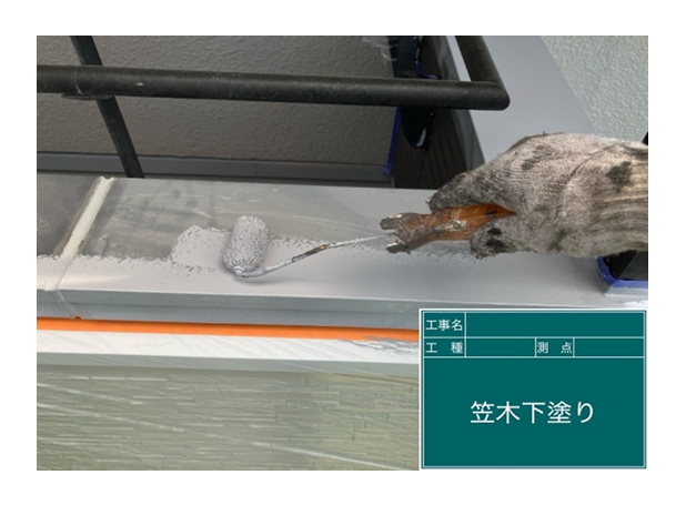 笠木に下塗りを塗布します。ベランダ外壁塗装工事② 上塗り