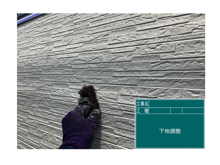 ベランダ外壁塗装工事①です。下地調整を行います。ベランダ外壁塗装工事① 外壁下塗り