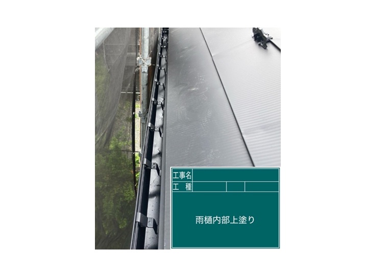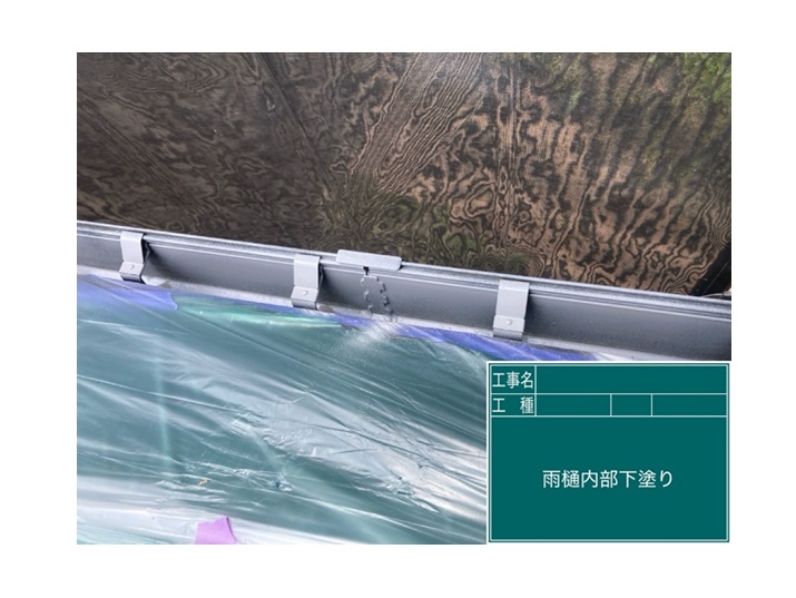 雨樋内部に下塗りを塗布します。雨樋塗装工事 雨樋内部上塗り