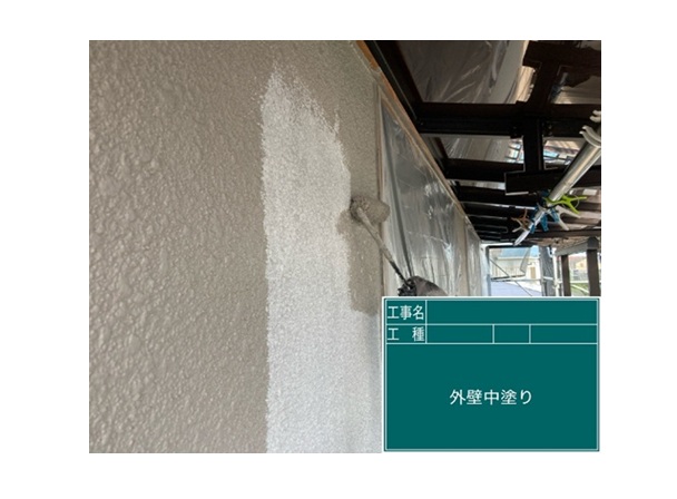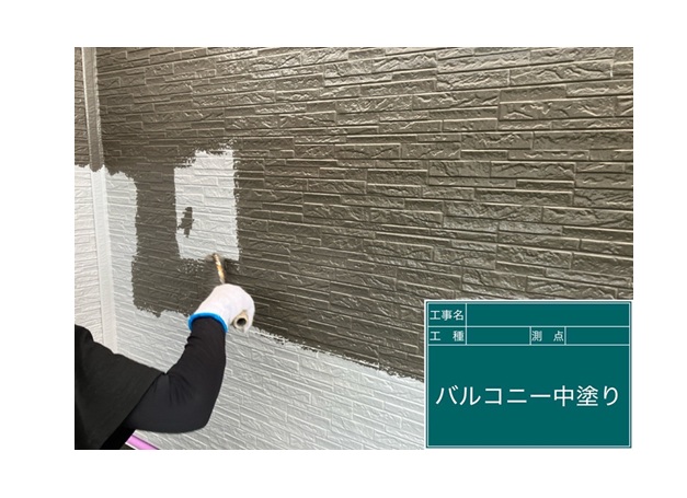 中塗りを塗布します。ベランダ外壁塗装工事① 上塗り