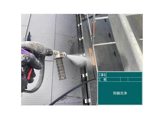 雨樋に高圧洗浄を行います。雨樋塗装工事 雨樋内部下塗り