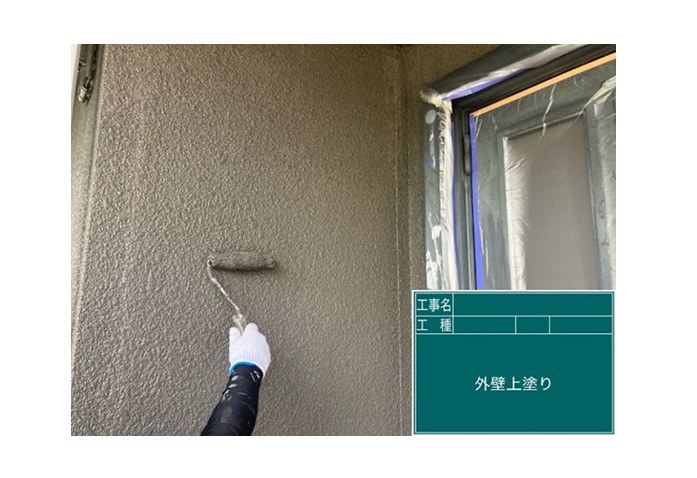 上塗りを塗布します。外壁塗料は「シリコンREVO1000」を採用しました。外壁塗装工事 上塗り