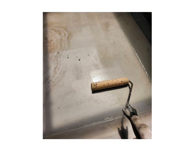 ウレタン防水の下塗りを塗布します。ベランダ床防水工事 ウレタン防水・トップコート