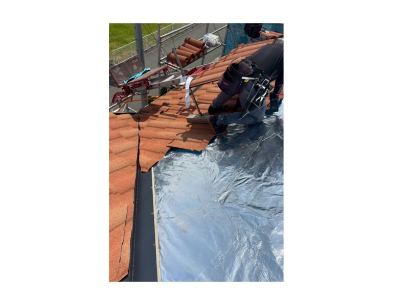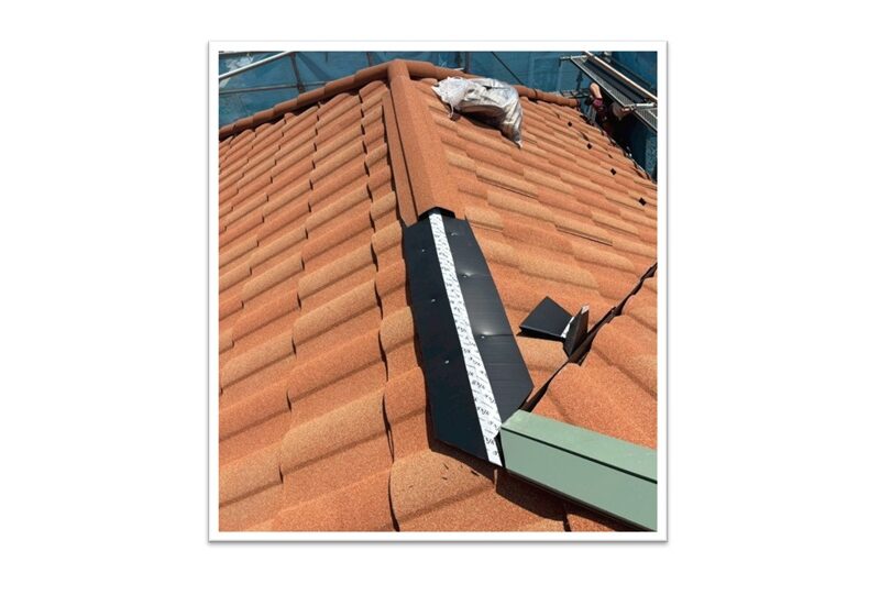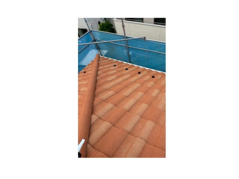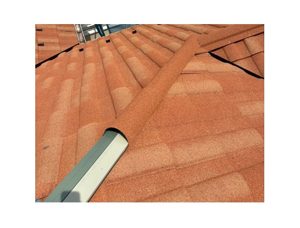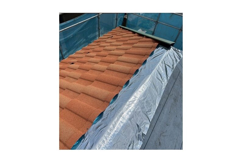 屋根材を設置します。屋根材は「D'Sローマン タスカニー」を採用しました。屋根葺き替え工事 葺き替え施工中