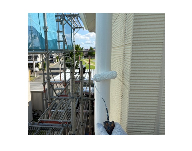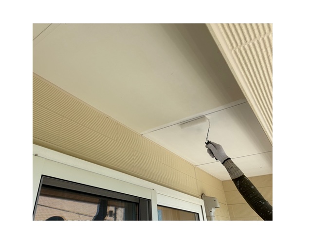 軒天二度塗りで仕上げます。塗料は「マルチエースⅡ」を採用しました。雨樋塗装工事 塗装中