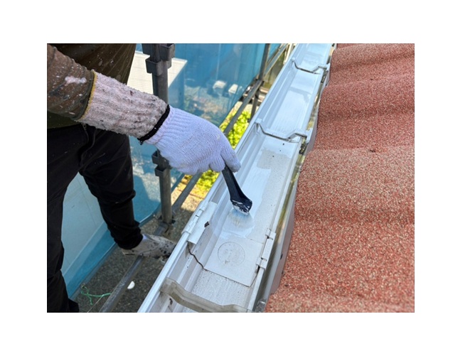 樋を二度塗りで仕上げます。塗料は「ウルトラSi」を採用しました。塗装工事 軒天塗装