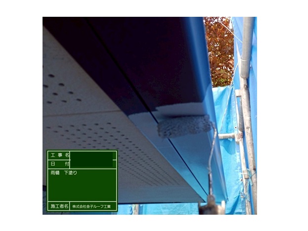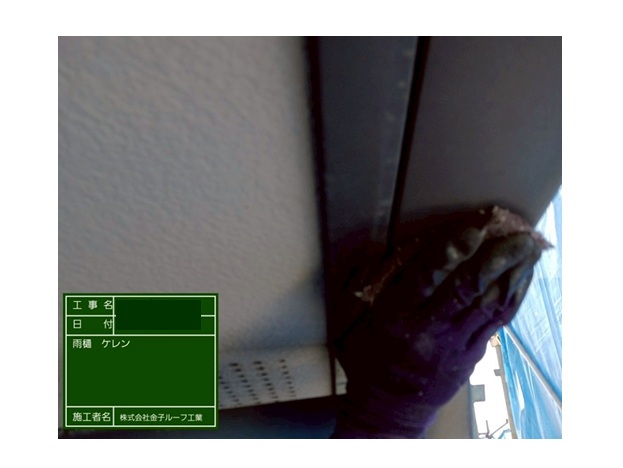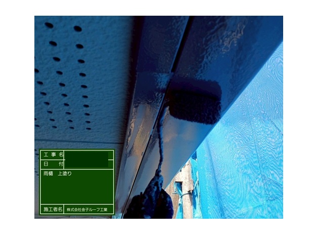 軒樋内側のゴミやヘドロを掃除してからジョイント箇所に応急処置的なコーキング・防水テープで補修した後に、塗装を行いました。