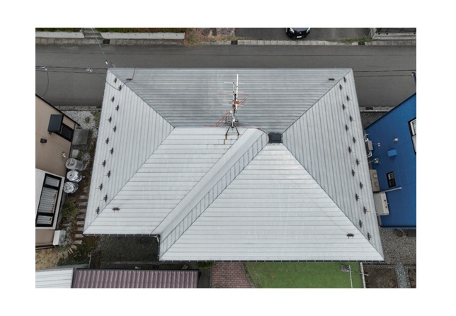 施工前の屋根は日焼けや紫外線により塗膜が薄くなっていました。加えて現状の雪止め取付箇所から強い錆びが出ており、一刻も早い塗装が必要な状態でした。