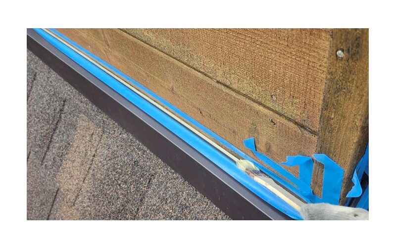 壁際雨押さえ包みコーキング工事です。プライマーを塗布することで被着面とコーキングの接着が良くなります。