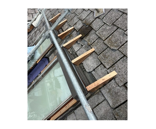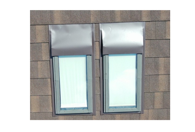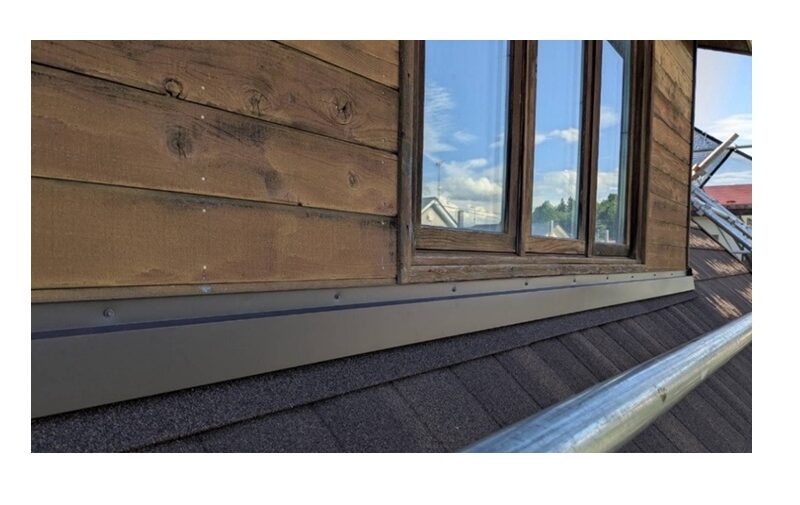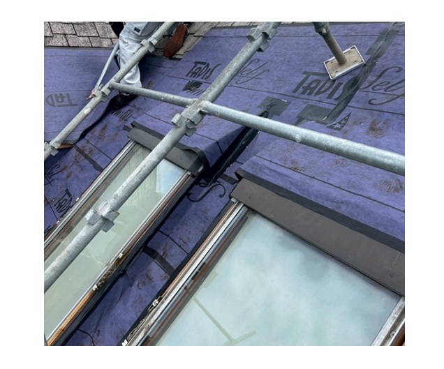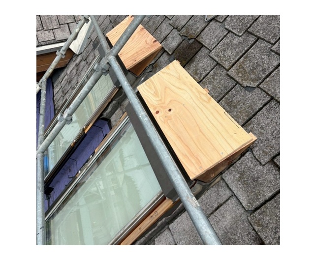 壁際雨押さえ包み工事です。下地、ルーフィング、板金を設置しました。