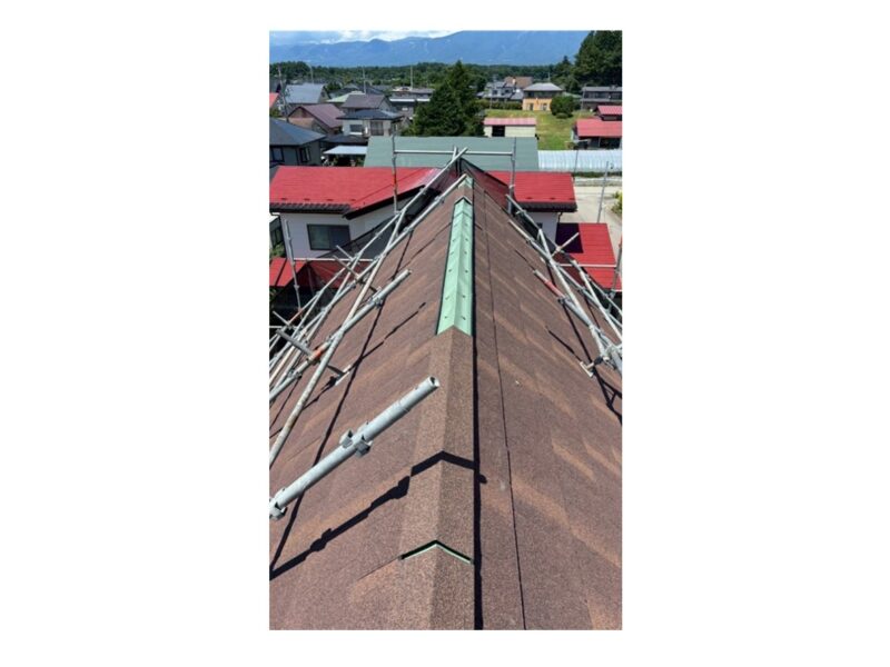 棟を新設し、さらに屋根内部の換気をよくするために、棟換気部材「棟換気リッヂベンツ」を採用しました。暑い空気がたまり易い住宅上部の棟に設置し、小屋裏の湿気や熱を効率良く排出する棟換気材です。