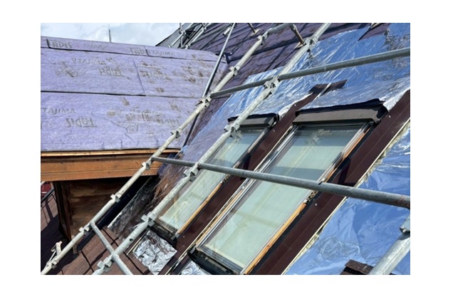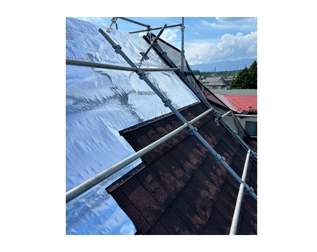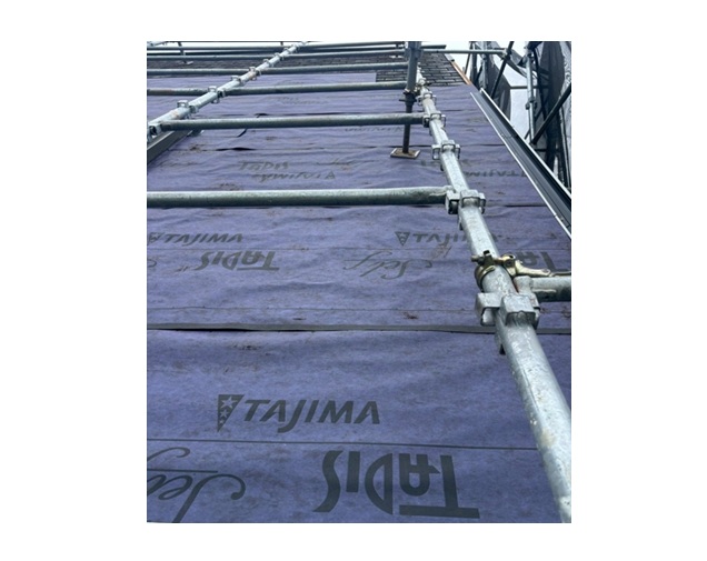 屋根カバー工事です。ルーフィング(防水シート)を設置します。