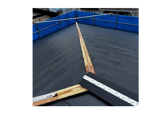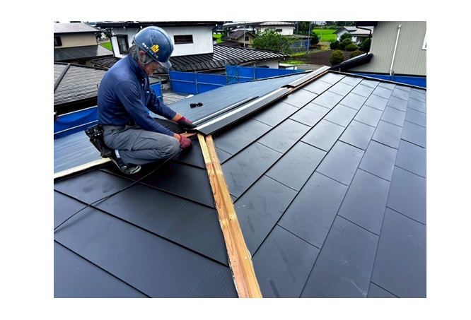 という特徴があります。葺き替えはもちろん、強くて軽量という特徴を生かして今回のような屋根カバー工法にも最適な屋根材です。