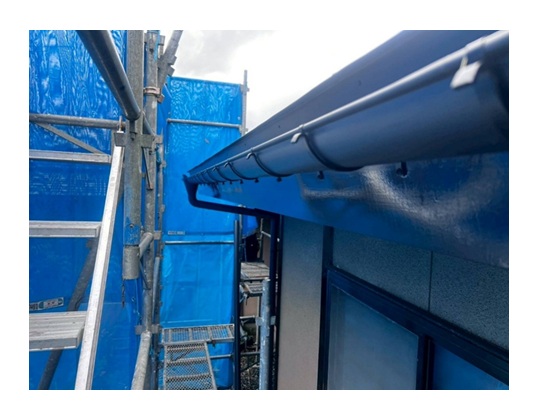 雪害による雨樋交換工事を行いました。既存の軒樋は外側に開き・傾きがあり雨樋としての役割は果たしていませんでした。また、軒樋を固定している吊り金具が下がり軒樋の内側に水が溜まり縦樋からの排水が上手くできなくなっていました。
