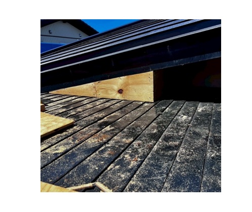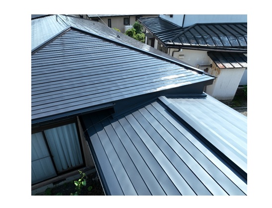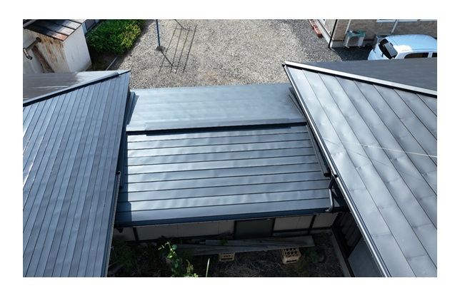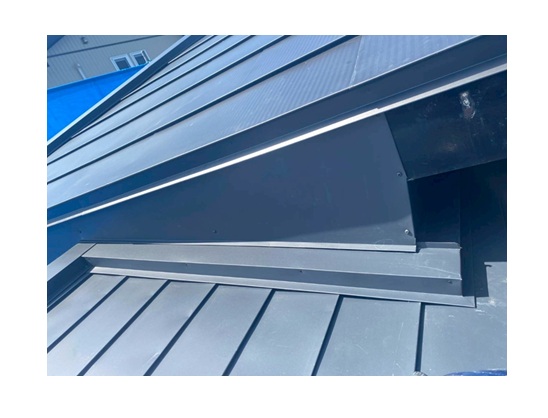 屋根カバー工事をする際に両隣の建物軒裏が干渉するために一部破風板を解体して既存の屋根の上にカバー工事を行いました。屋根材は「長尺横葺き 0.35㎜GL」を採用しました。
