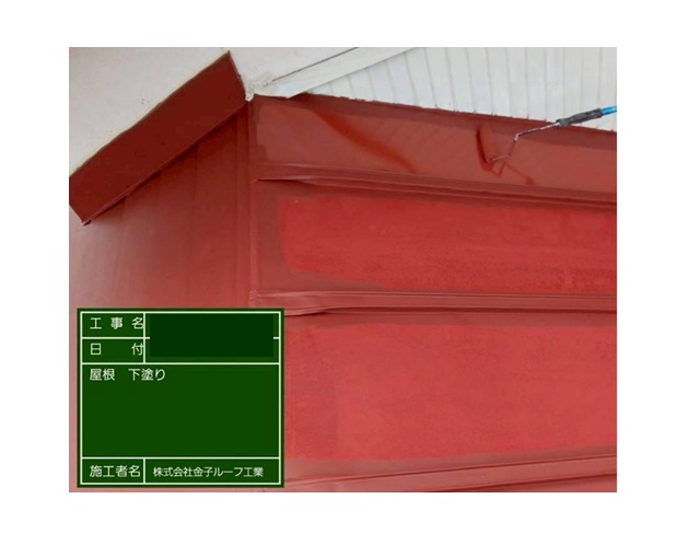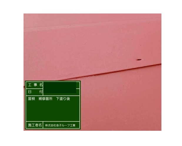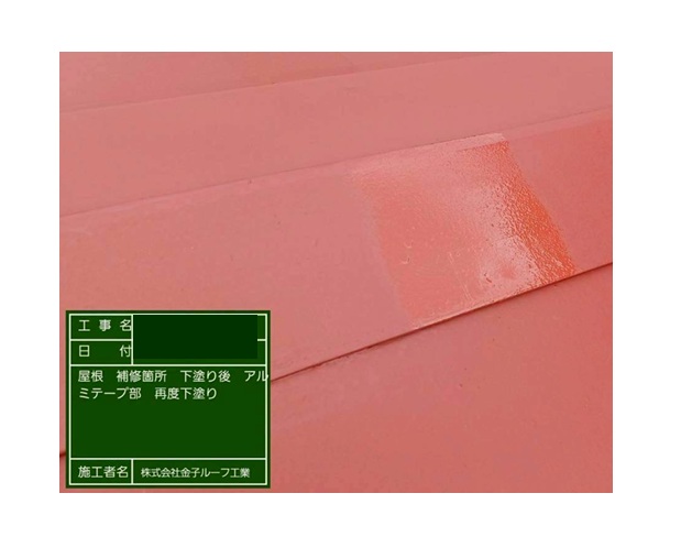 屋根塗装工事 屋根補修箇所下塗り後アルミテープ部再度下塗り