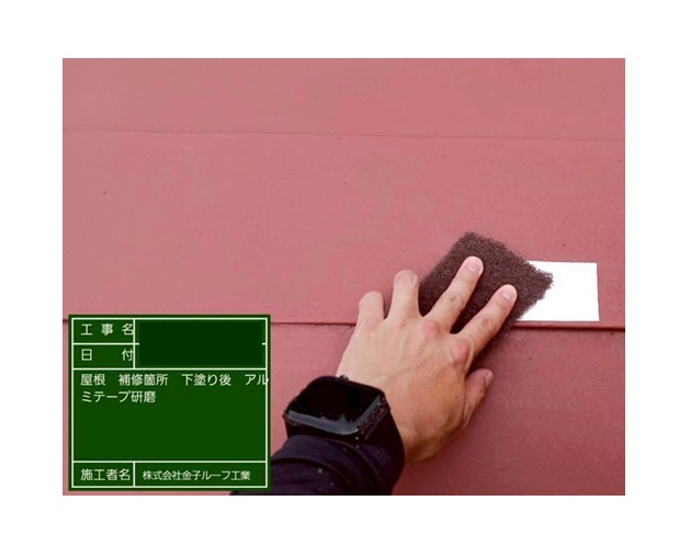 屋根塗装工事 屋根補修箇所下塗り後アルミテープ研磨