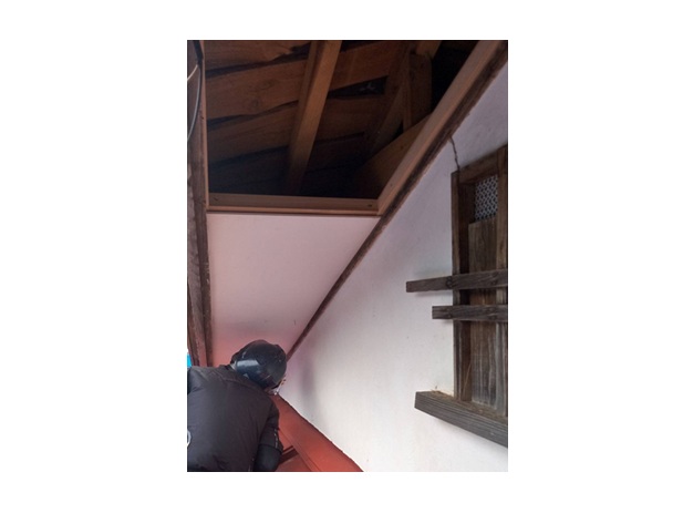 玄関屋根上の2箇所に小さい穴が空いていたため、防水テープで補修した上で塗装しました。