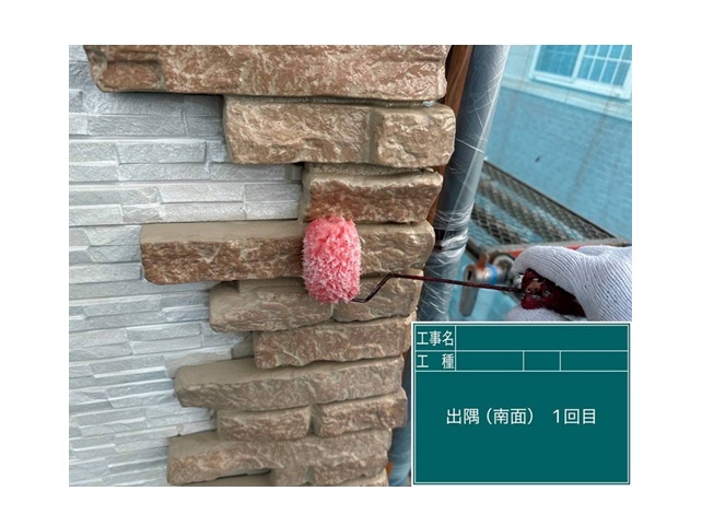 出隅(南面)に1回目の塗装を塗布します。