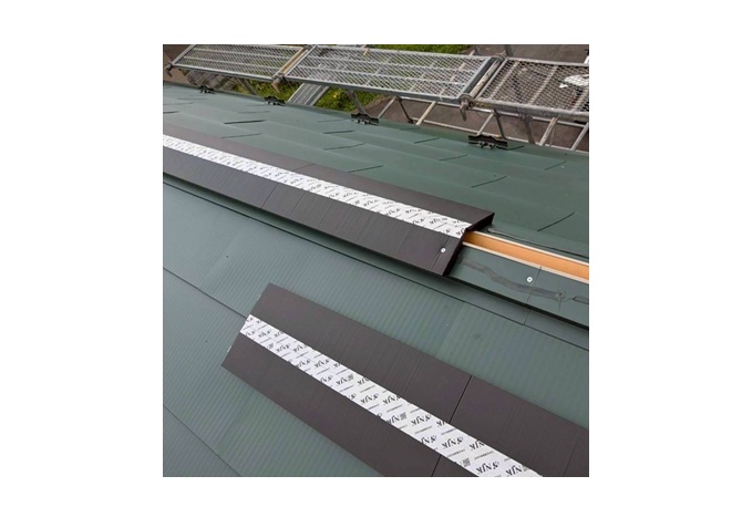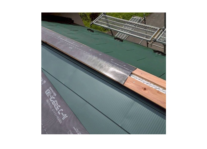 さらに屋根内部の換気をよくするために、棟換気部材「棟換気リッヂベンツ」を採用しました。暑い空気がたまり易い住宅上部の棟に設置し、小屋裏の湿気や熱を効率良く排出する棟換気材です。