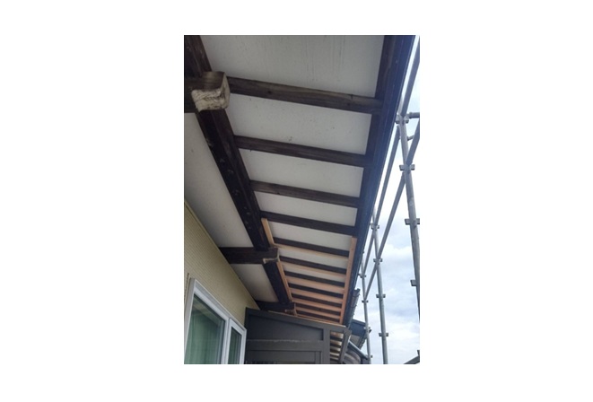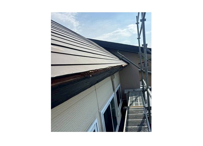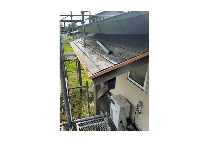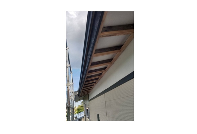屋根カバー工事です。広小舞解体です。広小舞とは屋根の先端に取り付ける板のことです。軒先を切断し、広小舞を交換します。軒先は腐ってる可能性が高いので弊社ではかならず取り替えています。