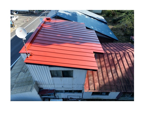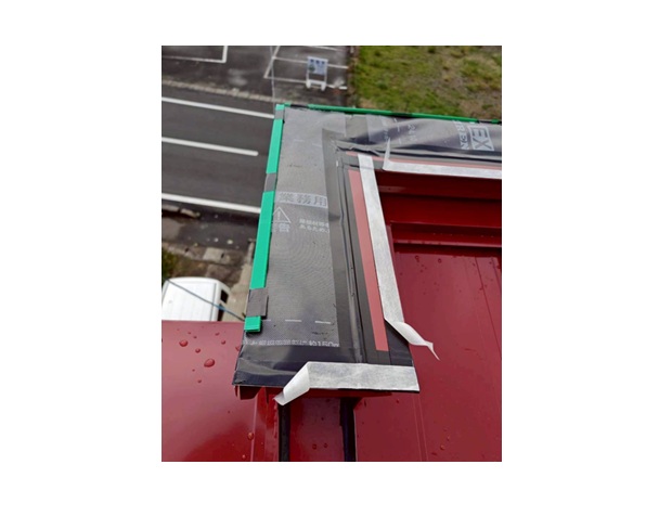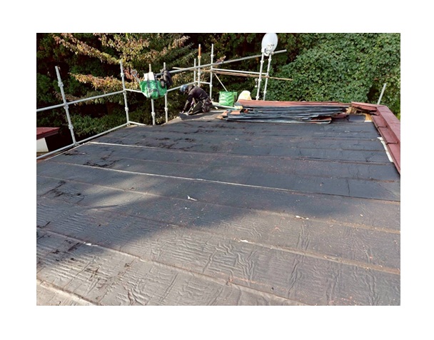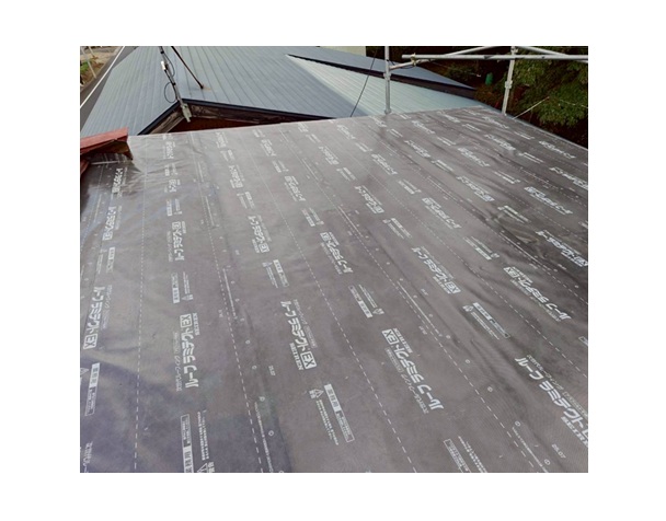 屋根葺き替え工事は屋根下地から交換できる唯一の工法です。屋根材は「立平葺き 0.35㎜GL」を採用しました。防水の要・ルーフィングは高品質の「ルーフラミテクトEX」を使用しました。屋根材をかぶせると見えない屋根下地ですが、実は屋根の性能を左右するとても大事なものです。