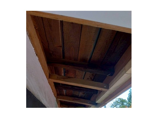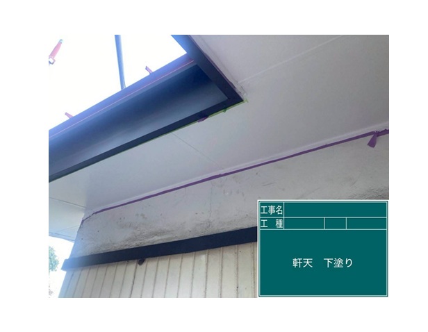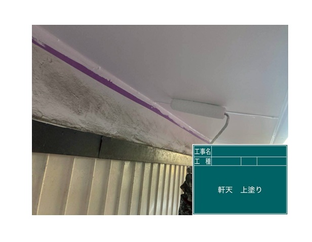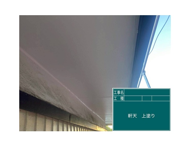 施工前の軒天は経年劣化で剥離や欠損が目立つ状態でした。劣化した部分を貼り替えて、塗装で保護しました。軒天は雨漏りや すが漏れ が起きやすい箇所です。軒下を時々見上げて、劣化している場合はメンテナンスを行いましょう。